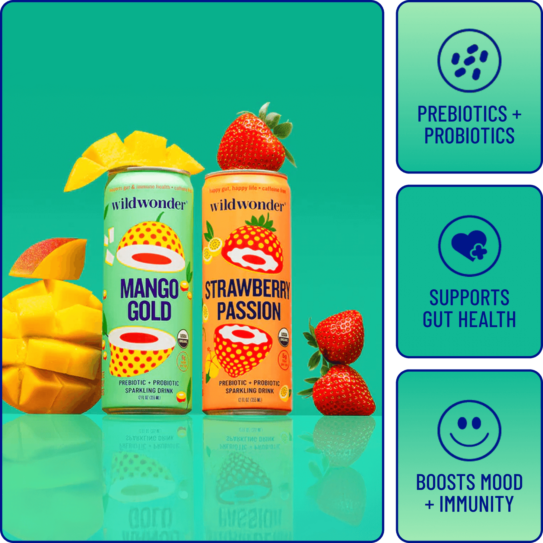 Strawberry Passion and Mango Gold — for a perfect mix of sweet, refreshing, and gut-loving fizz.
