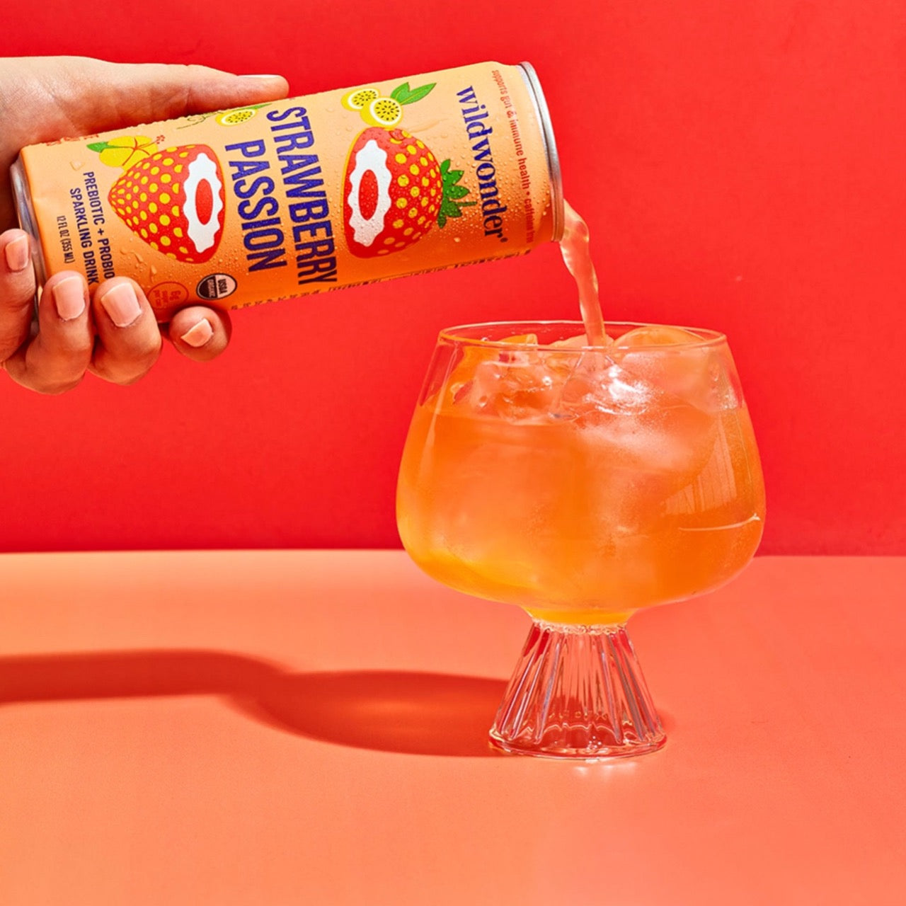 Fresh Brewed Hibiscus* (Carbonated Water, Hibiscus Flowers*), Strawberry Juice*, Passion Fruit Juice*, Agave Nectar*, Prebiotic Fiber Blend (Jerusalem Artichoke*, Chicory Root), Strawberry Flavor*, Monk Fruit Extract*, Live Probiotics (Bacillus subtilis DE111) (*organic)